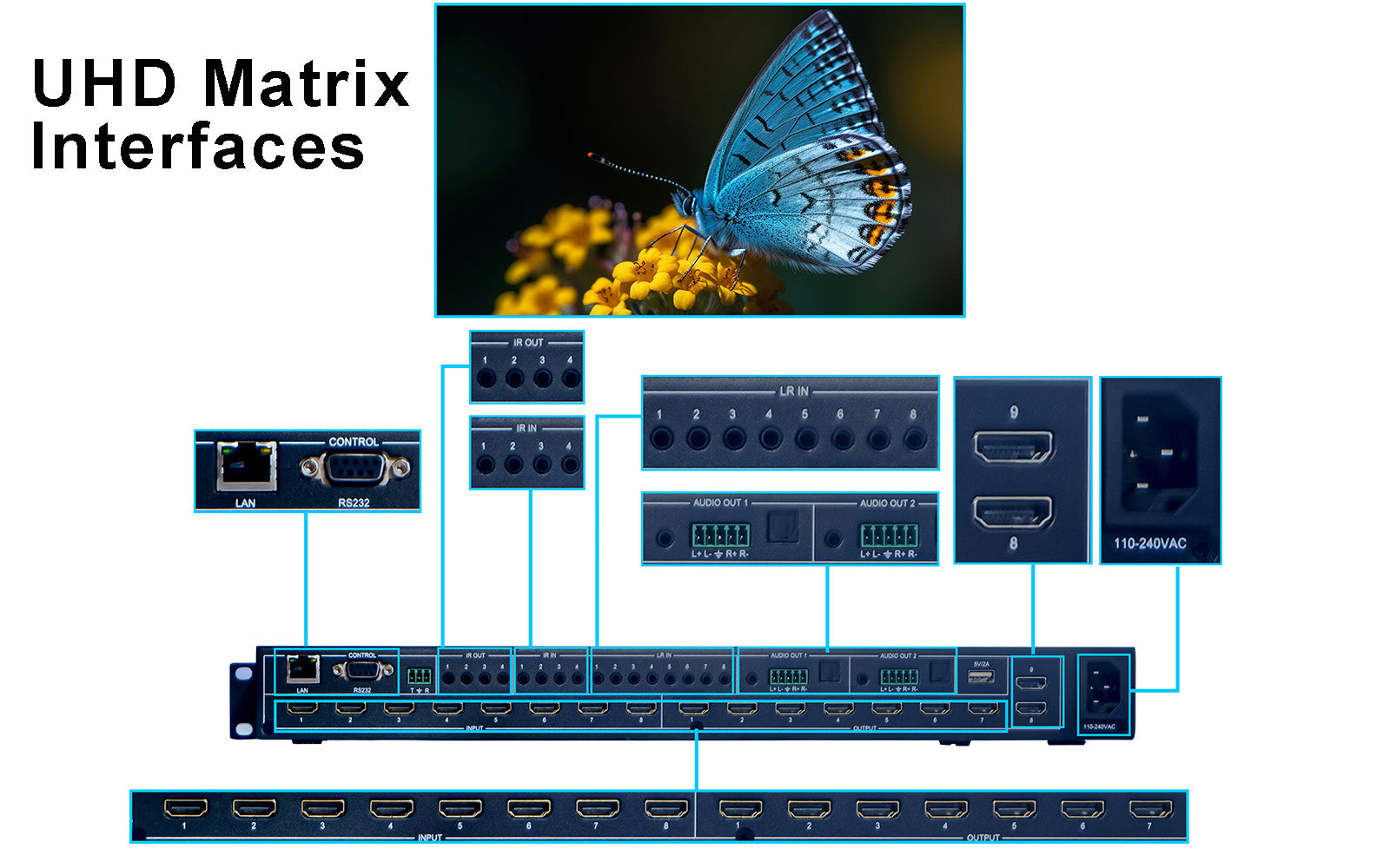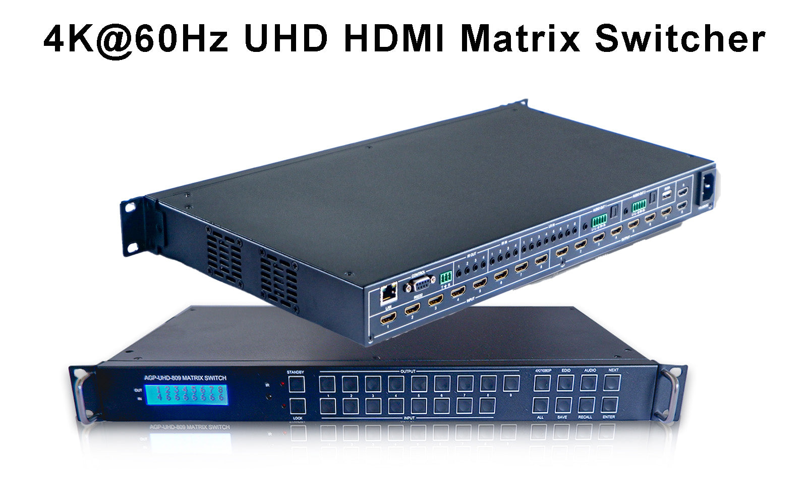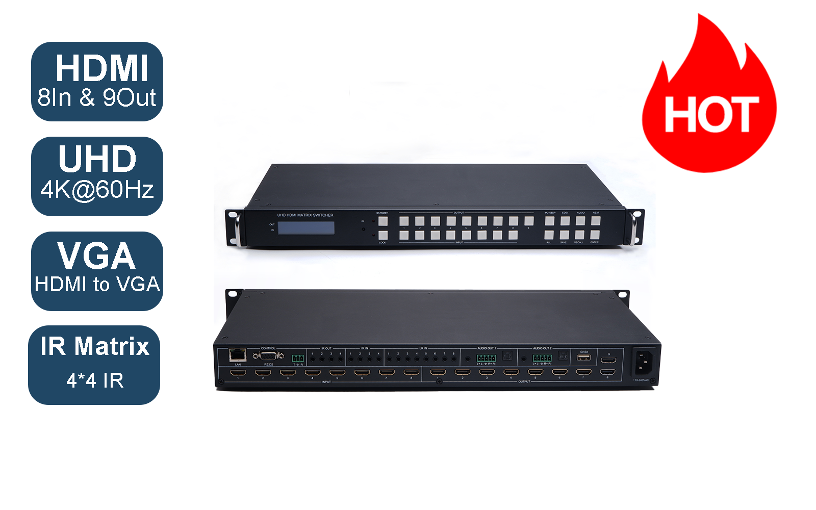 True UHD HDMI Matrix:  HDMI 2.0 (HDCP 2.2); max. 8 HDMI inputs in 4k@60Hz and max. 9 HDMI outputs in 4K@60Hz without compromizing on the switching performance. support downscaling for display. Support 2K upscale to 4K for display. Support 8*3.5mm audio inputs. Support 2*audio outputs(3.5mm audio and LR audio supported)