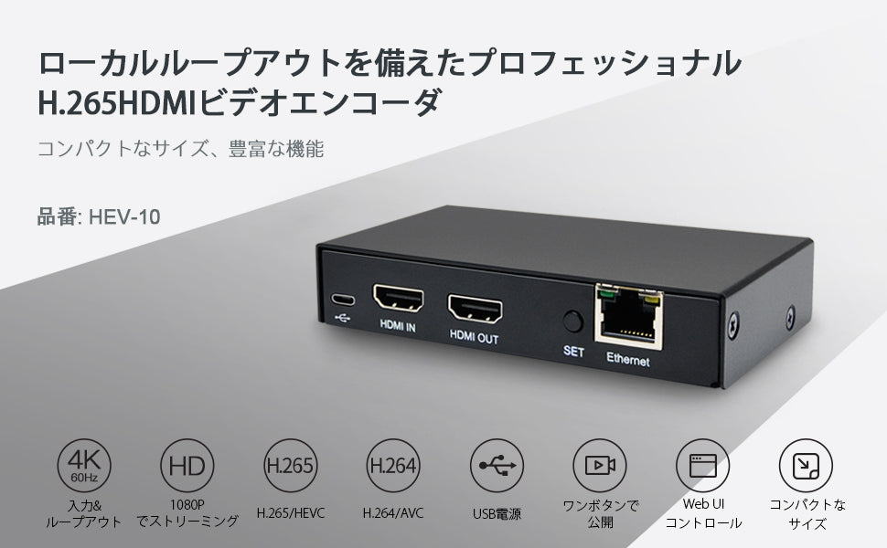 • 1×HEV-10 HDMIエンコーダー, 1×Micro USB電源ケーブル, 1×取扱説明書