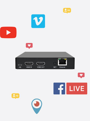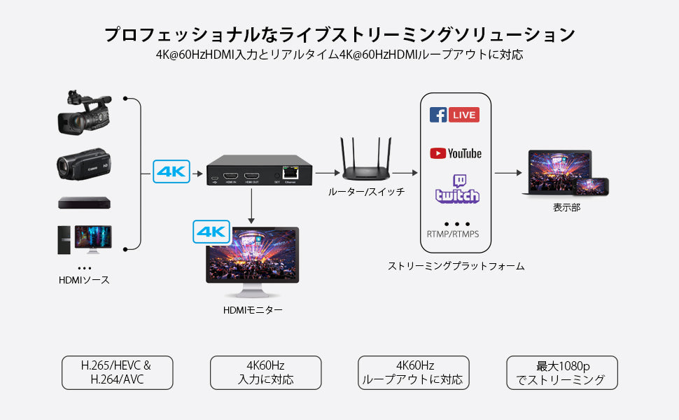 このDDMALL HEV-10は、コンパクトなプロ仕様のH.265ビデオエンコーダで、高品質で低レイテンシのコンテンツのストリーミングや表示を実現しています。最大4K@60HzのHDMI入力に対応し、YouTube Live、Facebook Live、Twitchなどの人気オンラインサービスや、最大1080pのカスタムRTMP/RTMPSサーバーに、最大16Mbpsのビデオビットレートで転送できます。また、HEV-10は、ゼロレイテンシー、最大4k@60Hzのループアウトを提供し、リライブモニタリングする際にローカルHDMIディスプレイに接続することも可能です。