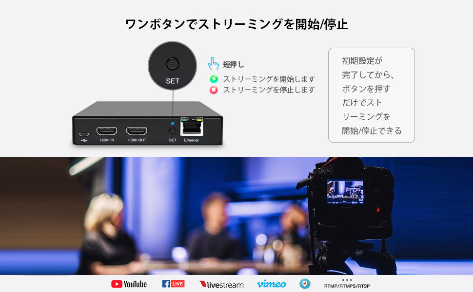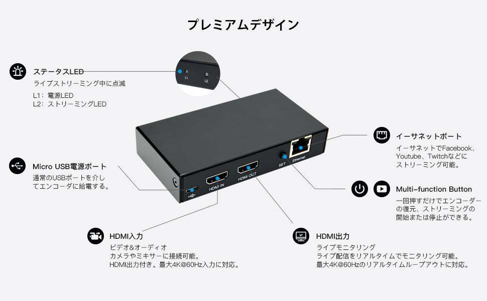 ●【簡単に使用】このポータブルエンコーダーは、Webベースのユーザーインターフェイスを介して制御されます。ユーザーはIPアドレスを介してアクセスし、解像度、ビットレートなどすべてを携帯電話、PC、タブレットでの一般的なブラウザーで設定できます。外部ソフトウェアやドライバーのインストールは不要です。また、ボタンを押すだけでストリーミングを開始および停止できる多機能ボタンが組み込まれていま。